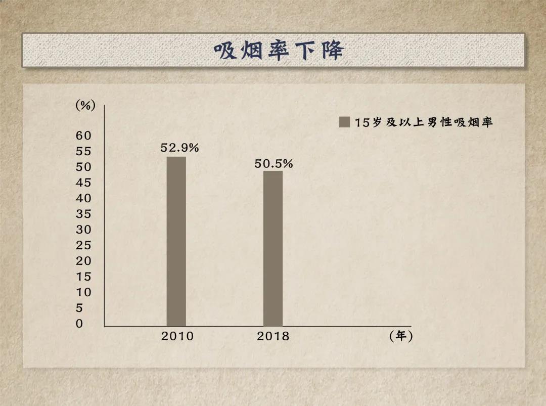 2010年至2018年,中國15歲及以上人群吸煙率呈下降趨勢,其中男性從52.9%降至50.5%。2018年,86.0%的人認為吸煙會引起嚴重疾病。