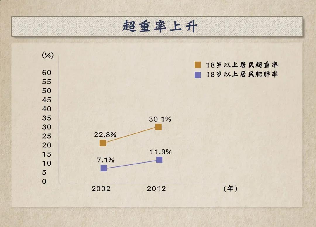 2002年至2012年,18歲以上居民超重率從2002年的22.8%升至30.1%,肥胖率從7.1%升至11.9%。2017年,全國歸因于高BMI(體重指數(shù))的心血管病死亡人數(shù)為59萬,占心血管病死亡總數(shù)的13.5%。
