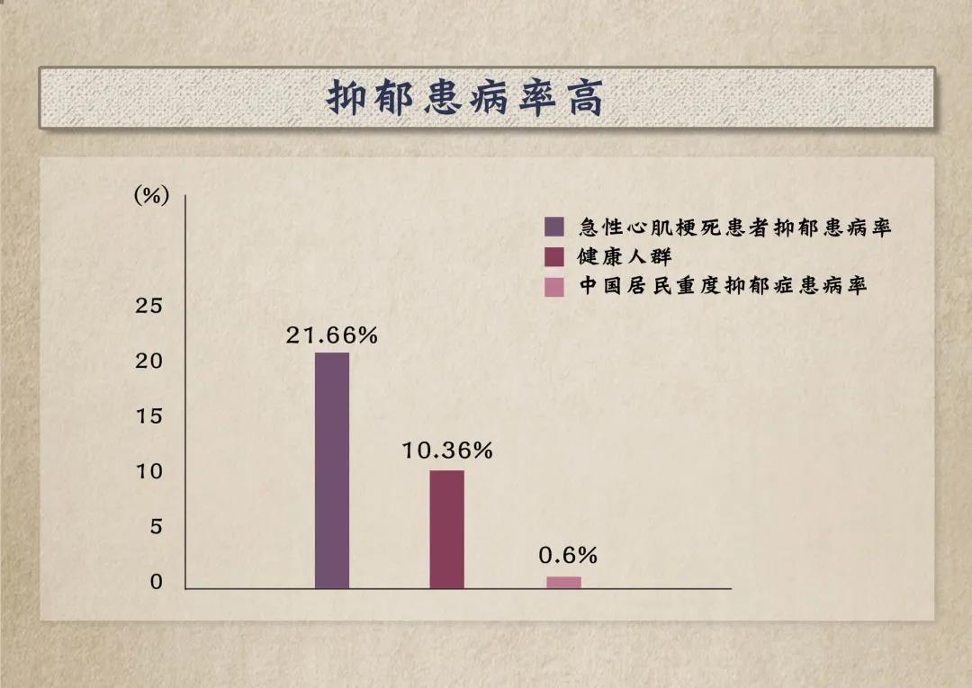 中國急性心肌梗死患者抑郁患病率為21.66%,明顯高于健康人群的10.36%。中國居民重度抑郁癥患病率為0.6%,重度抑郁癥是心臟病的危險因素之一。
