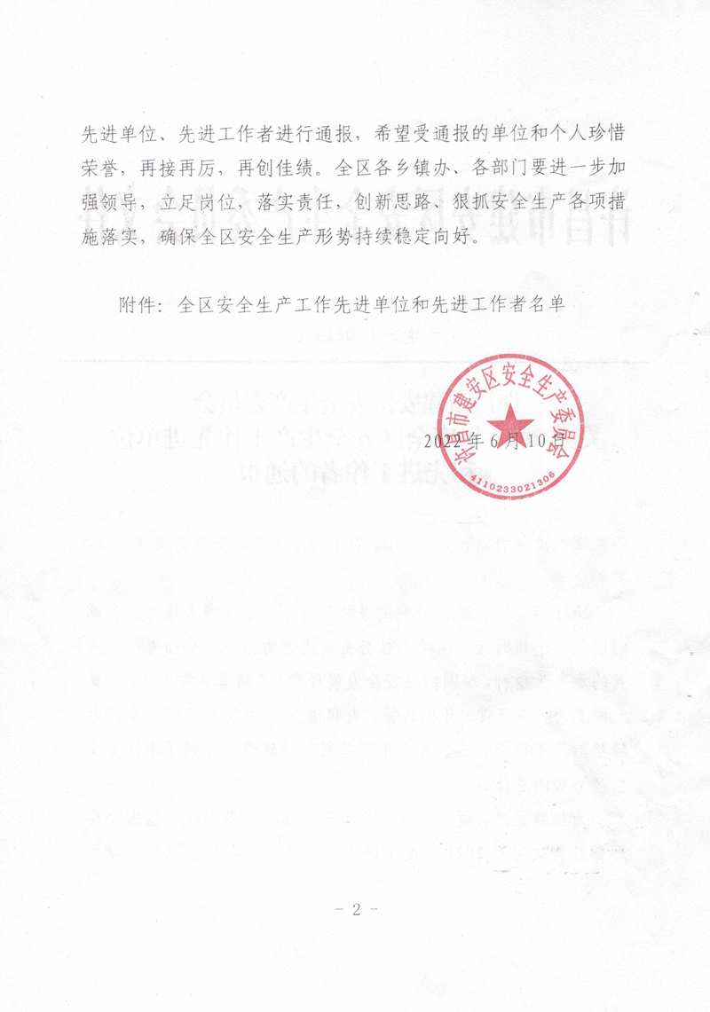 我司被評(píng)選為2021年度建安區(qū)全區(qū)安全生產(chǎn)工作先進(jìn)單位